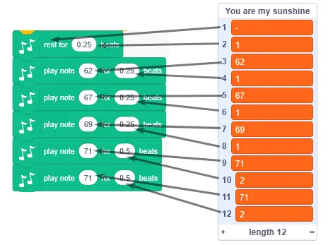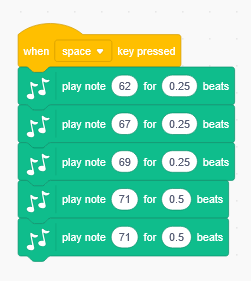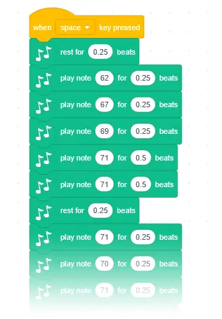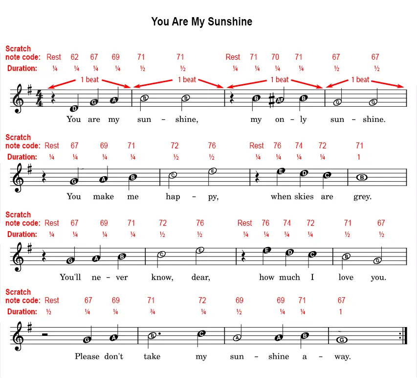 On the notation diagram above, the Scratch note numbers are written in red. Also the duration for each note is written underneath. So now we have enough information to write a Scratch program to play the entire melody. Go ahead and complete the melody in Scratch. Here’s the start, but you have enough information to finish it.