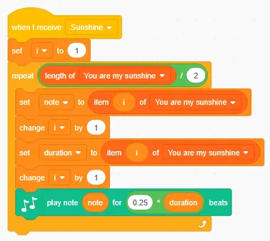 A more flexible way to set up the music is to use lists instead of joining multiple play note blocks together. This may allow us to enter our notation more quickly and we could use the same code for playing back different songs that we store in different lists. As an example, let’s set up our ‘You Are My Sunshine’ song using lists. We could create a list of just the notes but this is not the only information that we need to play a tune, we also need to know the duration for each note. We could use a separate list for the duration for each note OR we could just put everything into the same list – each note followed by the duration. Instead of writing decimal fractions, e.g. 0.25 for a quarter of a beat, we can simplify by using whole numbers. For this song, a quarter note is the smallest duration so we can use 1 to represent a quarter beat duration, 2 to represent half beat duration, etc. We would convert our code to a list like this:
