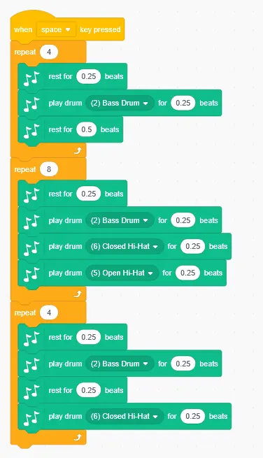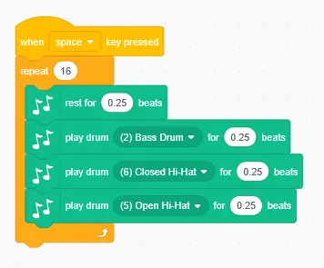 If you added the code for the complete melody to the same project where you added the drum beat shown previously, you should notice that the drum beat goes along with the melody and lasts for the same duration (16 beats). You can experiment with varying the drum beat slightly during the song. e.g.