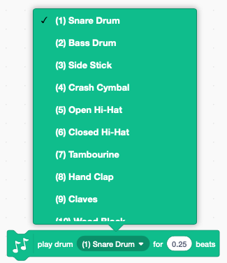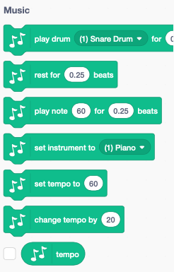 You can play music in Scratch by adding the Music extension. This will add the following new blocks: