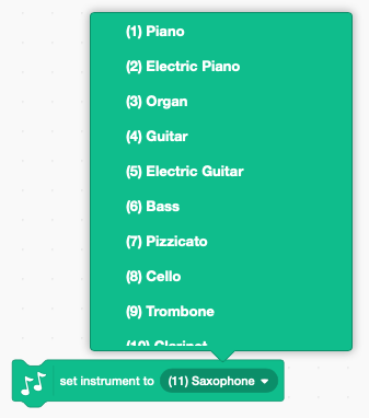 The default instrument is a piano (1). The block set instrument to allows to chose among 21 different instruments.