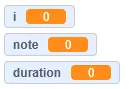 Next we will need to write some code to play our song from the list. The code needs to go through the list in steps of 2 getting the note and then the next item in the list which is duration. We will store note and duration in variables and then use the play note block to play the note for the required duration. We also need to use the rest block instead of play note block is a rest is required instead of a note. To keep track of where we are in the list we will need a variable, this is often called ‘index’ or just ‘i’. Go ahead and make 3 variables, note, duration and i: